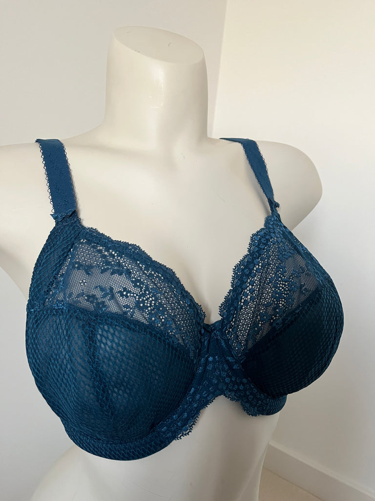 For complete confidence and a blue-tiful finish, uncover Elomi’s Charley Stretch Plunge Bra in a Petrol hue. The three section cups plus side support offer a natural forward shape, complete with a combination of embroidered stretch lace across the top of the cups and a chic diamond mesh fabric base.